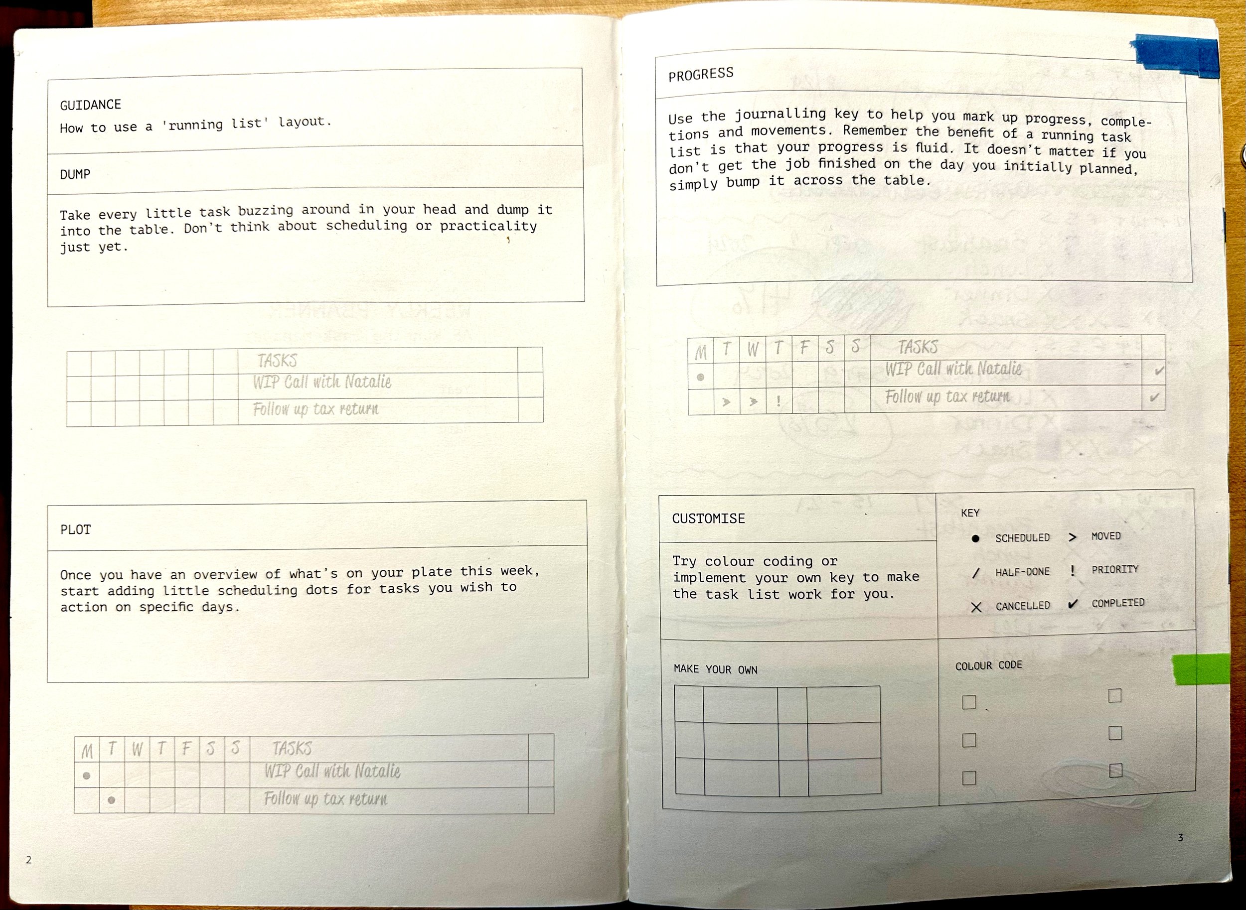 Below are a few pictures of the journal I use and a template you can print. The pictures include instructions on how to use this layout. The original journal is from the brand Creator’s Friend and is called Weekly Planner. It can be purchased at creatorsfriend.com.au